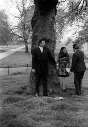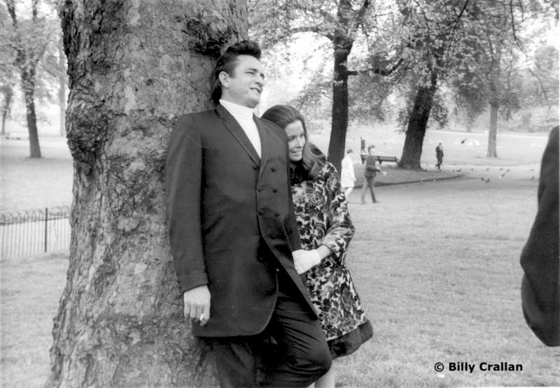 Johnny Cash leaves the Royal Garden Hotel in Kensington, London, to meet the press for a photographic session in Hyde Park and, on the right, Johnny and June in Hyde Park.