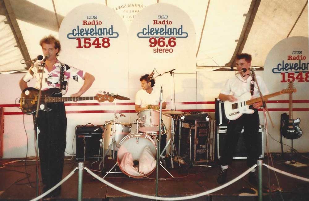 Hartlepool group The Videos, with singer Ged Duffy on the left, John Newsome on drums and Greg Bone with his Fender Telecaster guitar on backing vocals. It was taken at Darlington Show during the early 1980s.